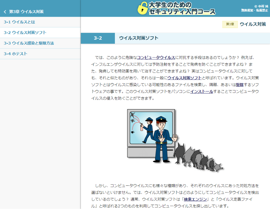 安全にネットワークを活用するためのセキュリティの基礎的な知識を身に付けることができます。キャラクターによる会話形式で、楽しく学習を進めることができます。